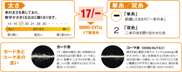 生地の厚さや風合い(肌ざわり)を判断する基準の一つとして糸の太さを表す「番手」による表示があります。